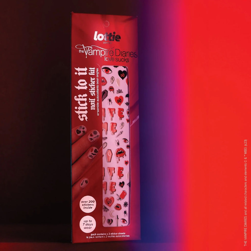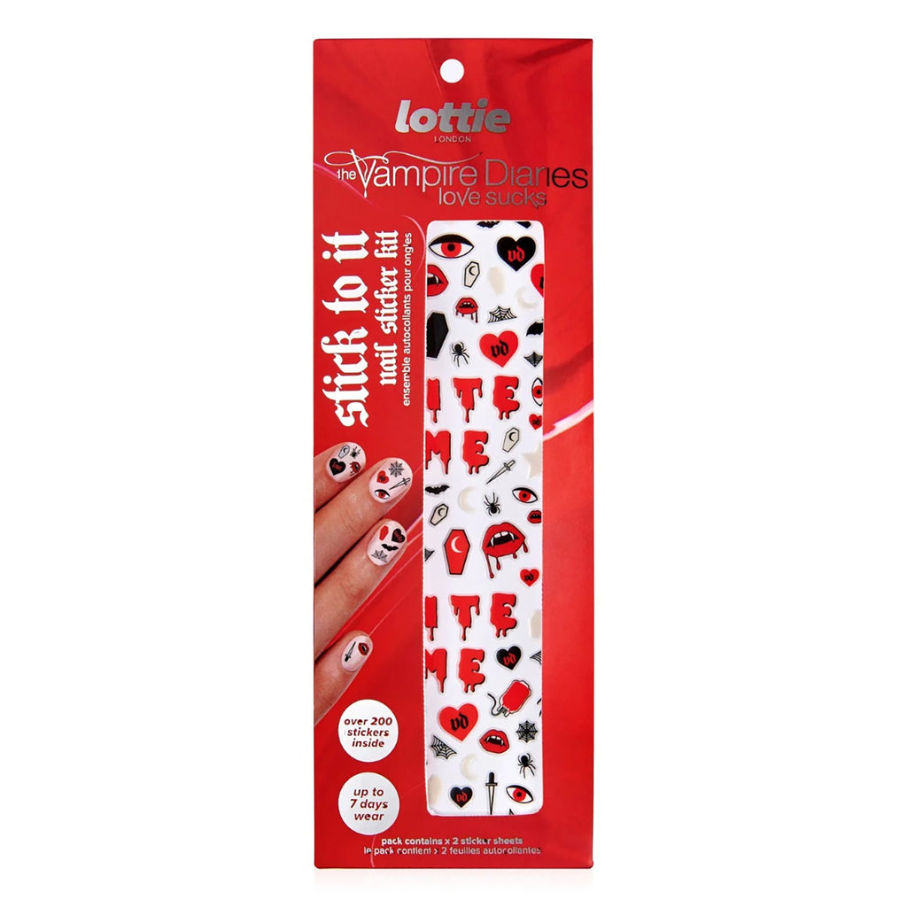 Trick or treat yourself to salon-style manicure from The Vampire Diaries x Lottie London Love Sucks collection. We've got you covered this halloween with our stick to it nails stickers. With over 200 nail art stickers per pack, these nail stickers make your at-home spooky mani’s a breeze. just stick and go! No drying time, no soak off and up to 7 days wear - salon perfect manicure in seconds!